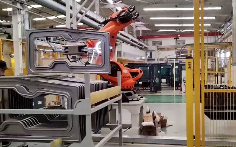 视觉引导机械手抓取汽车门框用3D定位架子的XY和角度还有门板的高度,用2D视觉系统定位门板的抓取位置,引导机械臂抓取工程车门板。